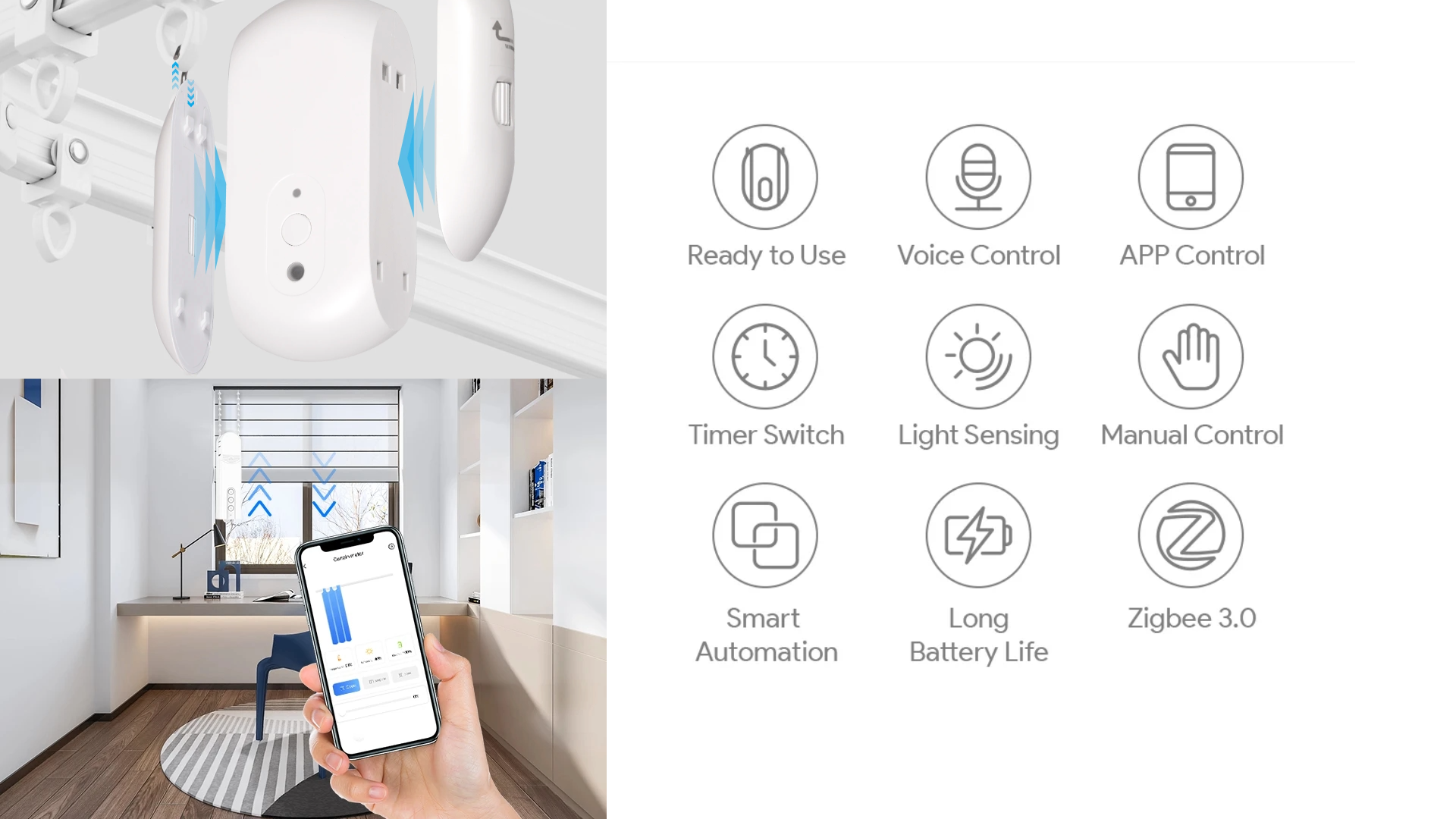 Der ADCB1 IU Rail Robot revolutioniert Ihre Vorhangtechnik mit intelligenter Automation, die Ihren Alltag vereinfacht. Bluetooth 5.0 und Zigbee 3.0 ermöglichen vollständige drahtlose Kontrolle – steuern Sie Ihre Vorhänge spontan von überall aus. Entscheiden Sie selbst: klassische AA-Batterien für Flexibilität oder der leistungsstarke USB-C Lithium-Akku für kontinuierliche, sorgenfreie Automation ohne Kompromisse.Der Timethinker ADCB1 IU Schienenroboter bietet intelligente Vorhangautomatisierung mit internationalen Zertifizierungen (CE, FCC, RoHS) und nativer Tuya-Kompatibilität.